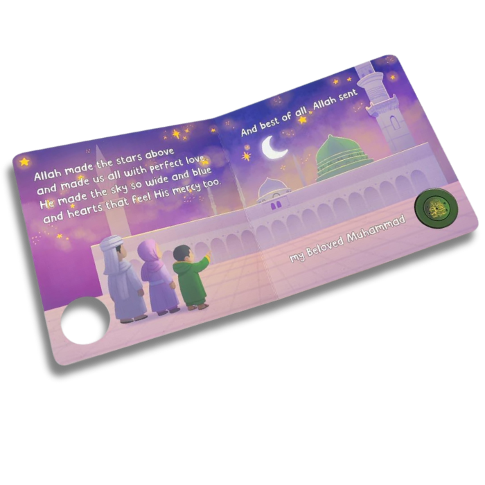 Immersive Sensory Experience: Features a built-in sound button with a phrase of Salawat and the calming sounds of Madina's gardens, bringing the poetic imagery to life for young readers.